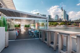 Eine Eventlocation anderer Art. Direkt auf dem Main hat man einen traumhaften Blick auf die Frankfurter Skyline. Gerade bei Sonnenuntergang wird dieser Eventlocation ein ganz besonderes Feeling verliehen.